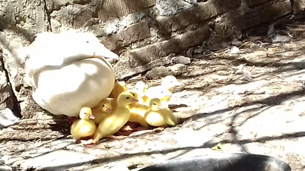 Che bello stamattina arrivare e trovarsi le paperelle tutte fuori spaparanzate sotto il sole. Il padre è un ottimo vigile anche se qualche volte si prende qualche beccata dalla consorte L'altra femmina (che invece è entrata in cova ieri) quando esce per mangiare/bere, avvicina incuriosita il becco alle paperelle che però vengono difese dalla madre