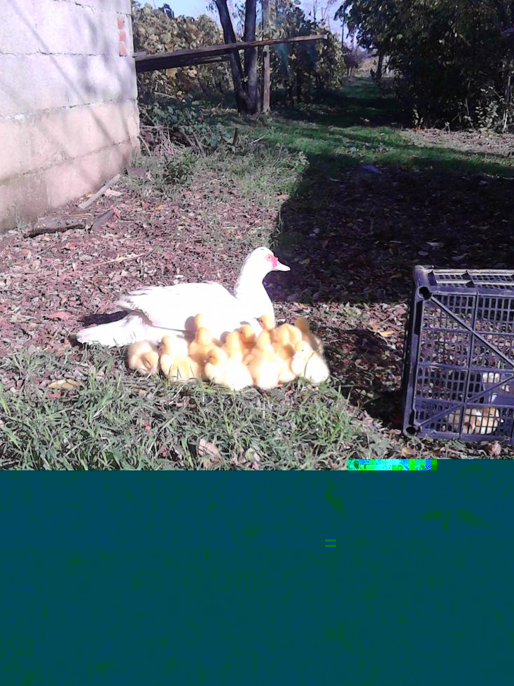 Eccoli, sono nati 19 anatroccoli su 23 uova. Uno era debole e non seguiva il gruppo ed è morto dopo un giorno. Un altro forse si è infortunato, stava bene ma il terzo giorno non seguiva più il gruppo, i maschi adulti davano come dei becchi ai piccoli e forse lui ne ha preso uno. E' morto. Adesso sono 17 e non li faccio uscire più perché nel recinto ci sono anche gli altri, comprese le galline e i galli e non è il caso forse. Li tengo chiusi con la mamma comunque il ricovero che gli ho fatto è bello grande. Un altro problema è il mangime. Non ho trovato un mangime specifico per anatre dove mi servo abitualmente e nemmeno al consorzio agrario. Ho due opzioni. Mi hanno dato il mangime granulare per polli (di cereali misti) oppure un allevamento industriale di ovaiole produce un mangime aziendale composto da cereali misti, soia, semi di girasole o favino (non so ci sono fibre nerastre) e integratori vari, tra cui calcio e proteine, inoltre è più sfarinato. Che ne dite? Poi la mamma evacua liquido con odori pesanti... ho letto sul forum che ci vorrebbe la parietaria, appena la trovo gliela do. Verdure miste le lascio scegliere quando la faccio uscire al pascolo, ma se devo raccoglierle io cosa mi consigliate? erba medica? bietole? ho visto che i maschi mangiavano anche le foglie di albicocco e prugno, in questa stagione, mezze ingiallite e la mamma quando era in cova mangiava anche le ghiande, ma se gliele davo io sbucciate no... boh forse le sceglieva lei più o meno mature. Possono gradire anche le ghiande secondo voi? Vi ringrazio per l'attenzione.