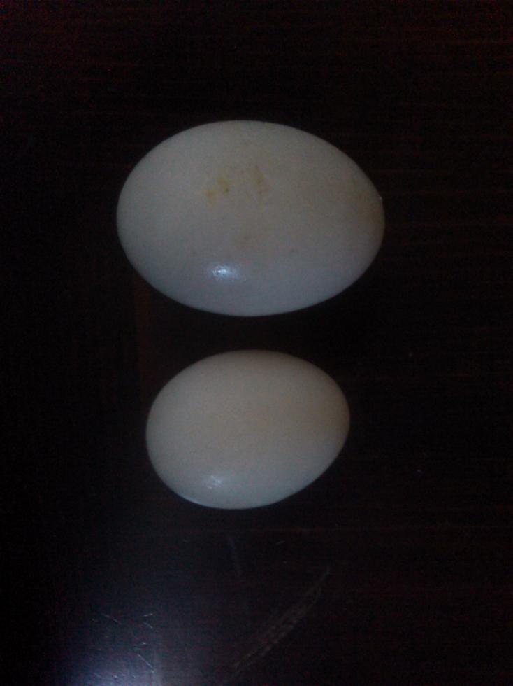 Al momento non so se ho una bilancia cosí sensibile, però ti mostro questa foto, che mette a confronto un uovo di germani domestici (simile alle dimensioni di quello di una gallina), con quello degli incroci.