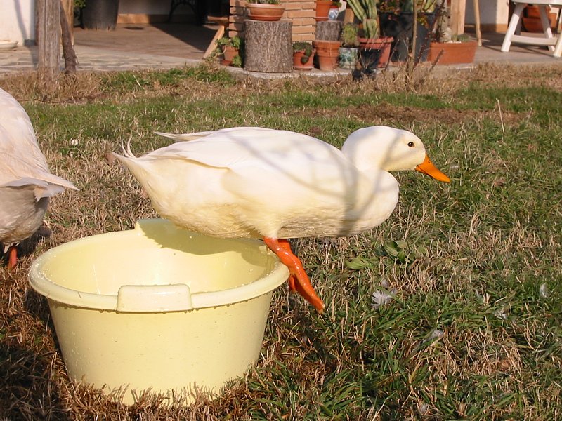 se parliamo di anatre comuni o anche anatre pechino, quelle bianche con il becco e le zampe gialle per intenderci, il maschio si distingue perchè intorno ai quattro mesi fa il ricciolo sulla coda.