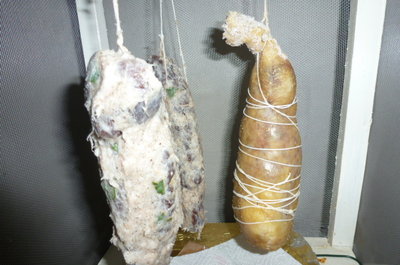 Ecco la mia pprima produzione di salumi di anatra:salame con carne di anatra e grasso di maiale insaccato in collo di anatra e petto di anatra fatto come si fa il prosciutto, messo sotto sale 18 ore e poi ingrassato con lardo pepe alloro e fatto il tutto stagionere per una 60 di giorni. Tra due giorni altra produzione solo che questa volta farò salumi insaccati in budello di maiale di petto di anatra macinato magro con pezzi di lardo di maiale, questa volta con la macchina per insaccare visto che facciamo la salata....credo che saranno squisiti con aggiunta di finocchio bastardo pepe cannella e aglio.