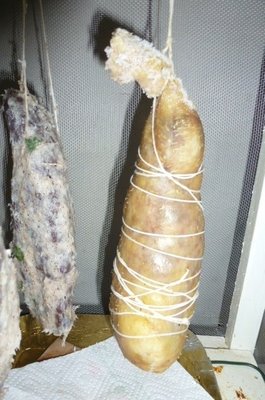 Ciao a tutti, riguardo a quello che chiede michele...be il salume autentico va fatto con collo di oca, lo leghi all" estremità più larga e dopo aver salato la carne e insaporita insacchi il tutto nel collo e tenti di renderlo sodo senza esagerare perche il filo potrebbe cedee. Quanto al sapore , ancora non lo so visto che farò passare altri 10-15 giorni...almeno due mesi me li prendo...spero bene soprattutto il petto salato e fatto tipo prosciutto è per lo più un esperimento...speriamo bene. Riguardo ai salumi preparati con le tre mulard che avevo detto di quelli non ho ancora fatto le foto.....sembrano ciabuscoli normali, infatti li ho fatti con il budello di maiale ...ora sono in soffitta a stagionare dopo una nottata vicino al fuoco.Il mio intento era di fare un salame lardellato ma mio suocero ha comprato troppapancetta di maiale cosi mi è venuto un impasto tipo il ciabuscolo.....4 da 6 etti l" uno....speriamo bene, come li assaggio posto il tutto e se posso posto anche le foto ...a presto.