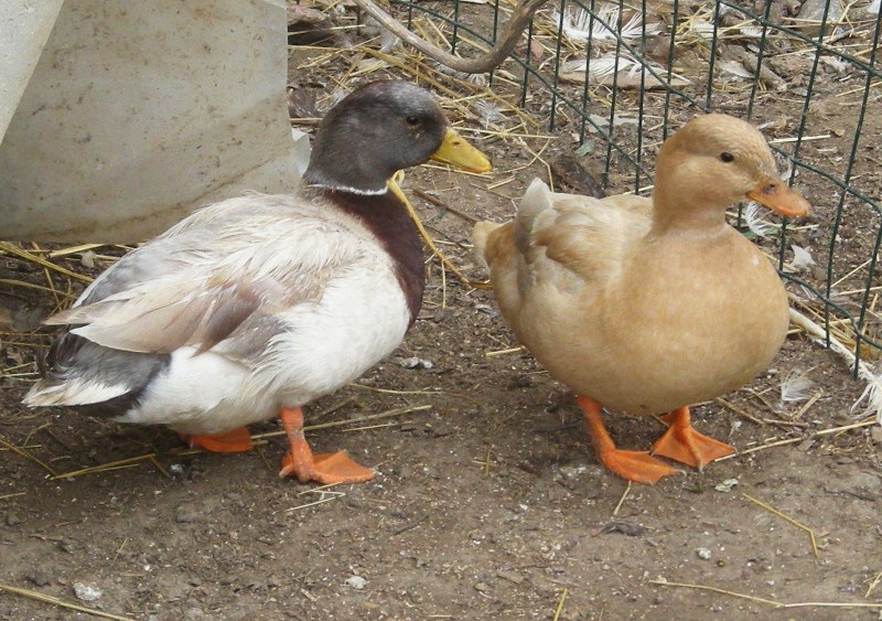 Sono delle anatre nane... Questa colorazione in questa razza se non sbaglio viene chiamata "giallo pisello"... Ripeto ancora il dubbio sulla dominanza genetica... Per curiosità, la femmina ha mai deposto?