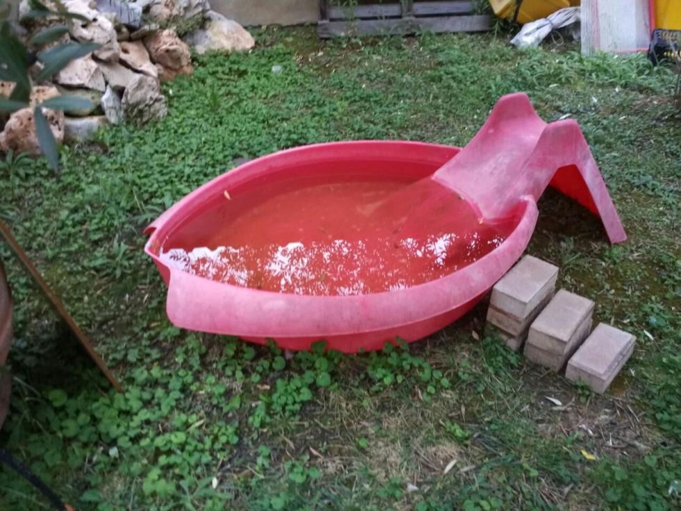 La piscina come si vede è una vecchia piscina per bimbi, mi è stata data da un mio parente che la usava per le sue 2 anatre, vissute 10 anni, e si facevano sempre il bagno, tuffi e quant'altro.