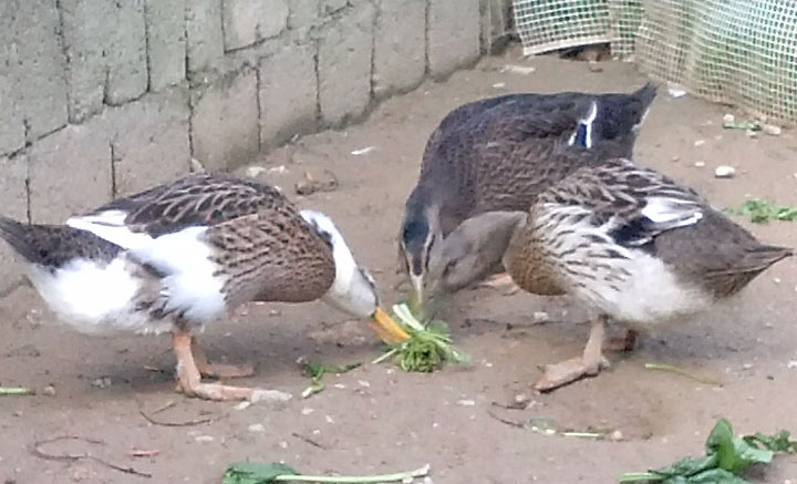 Quella a sinistra é un mulard(ibrido)..forse femmina..Quella a destra che mangia la verdura é una germana femmina e l'altra un po più scura secondo me é un maschio di germano che deve cambiare il piumaggio ancora...Perché noto che sulla testa ha del verde,ma non capisco se é l'ombra o é realmente cosi..Attendiamo il parere degli esperti..  Secondo me é cosi..