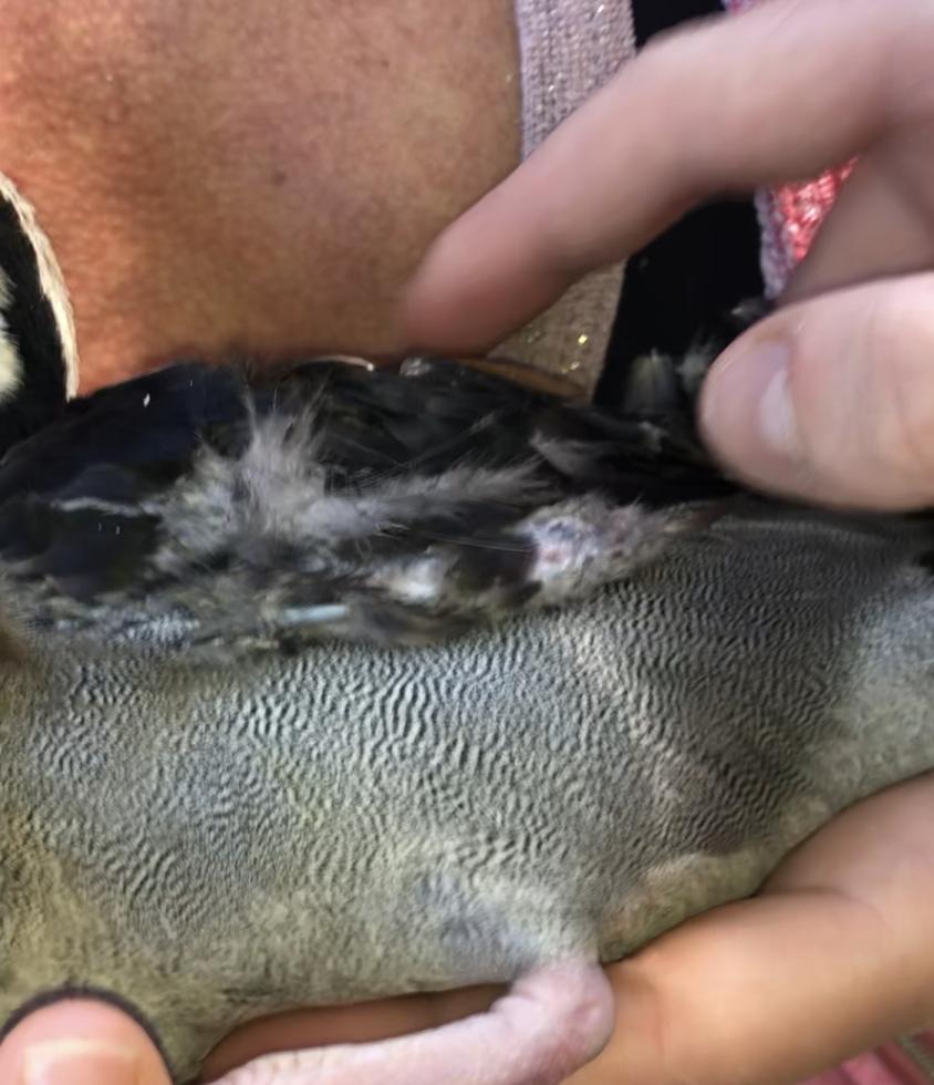 Ovviamente non riesce più a volare, e appena mi avvicino è particolarmente spaventata e sta con la bocca aperta.