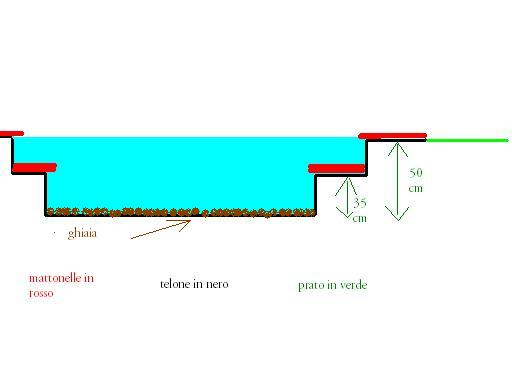 LAGUNABLU ha scritto: Salve a tutti , presto mi regalaranno 3 anatre mute, ho pensato di costruire un laghetto con il telo, ma me lo hanno sconsigliato, sembrerebbe che le anatre sguazzando nell'acqua possano tagliarlo con le unghie delle zampe, vi risulta?? voi che accorgimenti avete preso?? Grazie. Sono molto, moooltooo, mooooolltooooo belli questi anatroccolini  ciao, grazie, dipende dal telo che usi, quello il polietilene certamente si fora con le unghie e poi ha una durata di 1 anno perchè causa sole e freddo si rompe, anche se esiste quello di durata 24 mesi, ma la resistenza ai graffi è la stessa. Devi usare un telo per laghetti, può essere di pvc telato, tipo quello delle piscine o in gomma che si trova presso i rivenditori per prodotti per laghetti. Ti consiglio di chiamare una ditta che produce teloni in pvc per camion, te lo fanno del colore che vuoi e della misura che vuoi,. In entrambi i casi il prezzo è abbastanza alto, a me per un telo 7x6 hanno chiesto 700 euro. Ho risolto cercando su http://www.subito.it" target="_blank un telone per piscine e lho trovato a 100 euro misura 6x7, anche se non è facile trovarne. Altrimenti potresti usare un telone per agricoltura, quello bianco da una parte e nero dall'altra mettilo a tre strati, col nero a contatto con la terra e il bianco a vista, per evitare di attrarre calore, il prezzo è molto più basso ma tieni presente che a fine stagione devi svuotarlo e controllare che il primo strato non sia forato, al massimo puoi sostituirlo con poche decine di euro. Altro consiglio crea intorno al laghetto un gradino a 15 cm sotto l'acqua, dove possono appoggiarsi con le zampe per entrare e uscire e ricoprilo con delle vecchie mattonelle messe al contrario per evitare che diventino scivolore, vanno bene anche dei mattoni, eviterai così che debbano arrampicarsi con le zampe e quindi fare dei fori, l'importanche è che le mattonelle sporgano sull'acqua. ti allego uno schizzo. ciao Iride