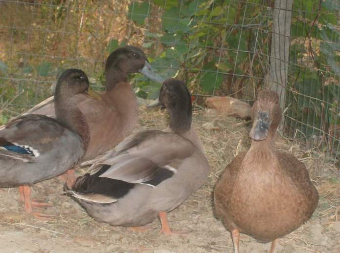 Questa è la mamma (quella marrone scuro) siccome ce l'hanno venduta per una germana,potrebbe essere un ibrido di germano e kaki? Comunque per per quanto strano, ha covato! (Ludovica)