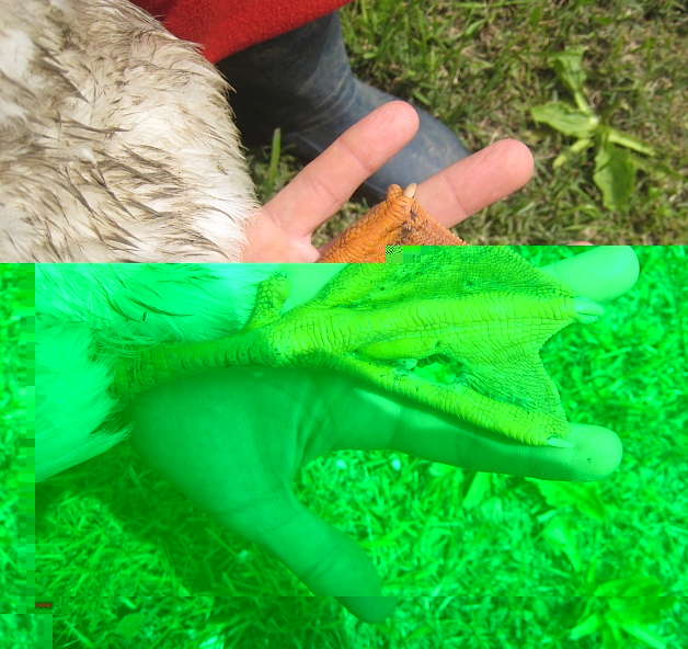 Due bei fori, uno completamente cicatrizzato mentre l'altro con qualcosa di attaccato. Ho pensato che essendo un'anatra anziana forse la pelle delle zampe si era consumata, poi penso ad un parassita, a un forasacco e mentre penso noto che anche altre due anatre di 2 anni hanno un buco in una zampa grande quanto quello di Bailey. Mi sembra quasi una cosa tribale. Bailey all'altra zampa ha già il buco ma la pelle è ancora attaccata e fa una specie di pallina che prima o poi si staccherà. Intanto quel piccino si vede che ha fastidio perchè tira su la zampa ogni volta che può.