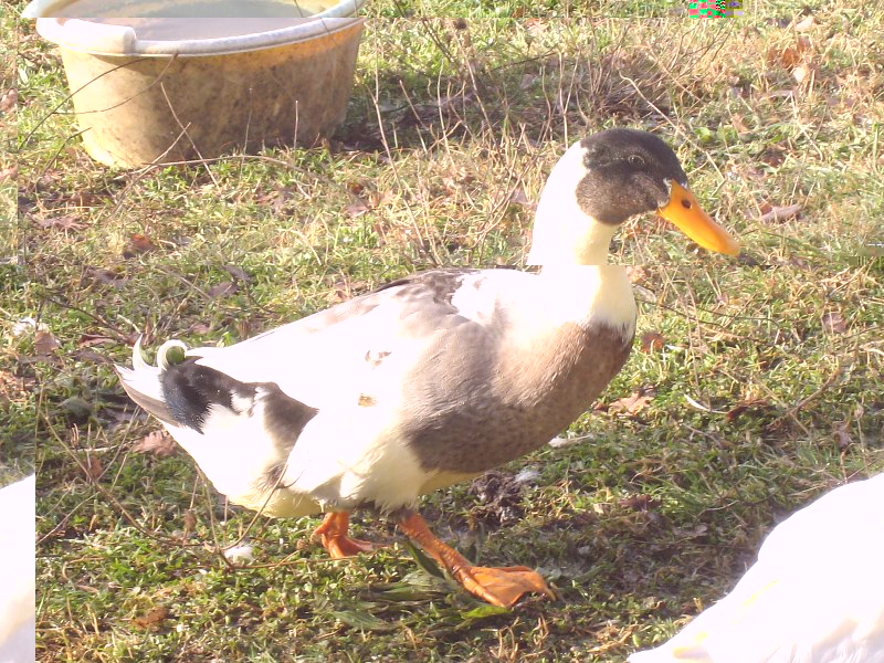 posto la foto di un'anatra (l'altra non l'ho più) e del gallo al quale mi sto affezionando non poco, è troppo bello ed è buonissimo. L'anatra ha 4 mesi e il gallo 7.