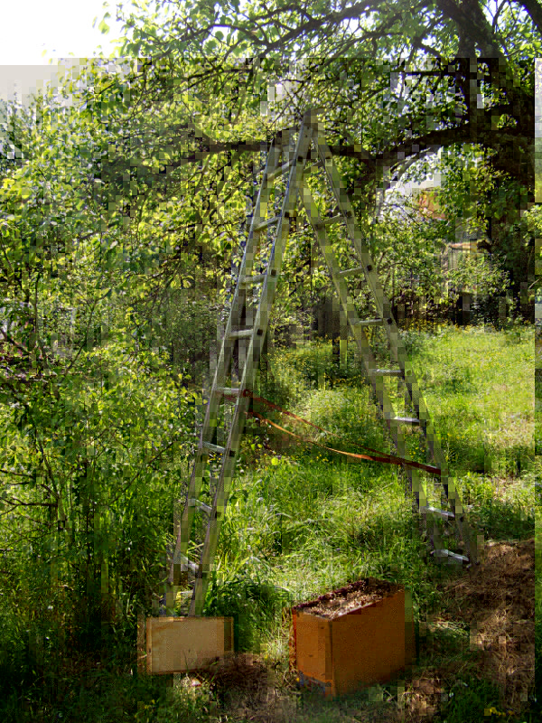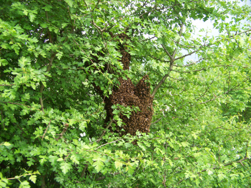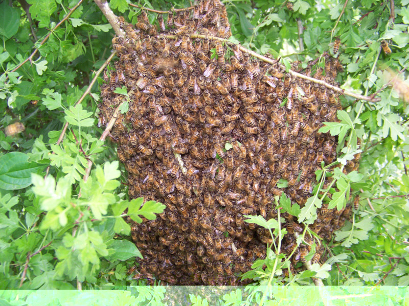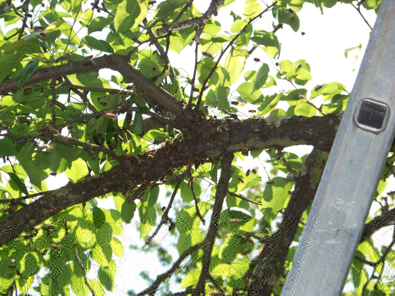 --> Sciame Catturato 13 Alle 11:15, prima di andare prendere il portasciami in prestito, mi telefona di nuovo mio suocero dandomi la bellissima notizia che gli sciami sono 2!!!!! Questo è su un tralcio di vite, molto facile da arrivare..... Mi dice che è molto grosso, allora chiedo di prendere non uno ma due portasciami in prestito...oltre ai fogli cerei che li avevo finiti..... Qundo ritorna però mi dice che lo sciame è andato via, non c'è più. Mi altero un pò visto che era grosso ma poi penso "Ne ho già abbastanza, va bene così". Torno a casa per prendere l'altro catturato la mattina e mentre passo sotto ai rami del solito pero, eccoti che noto lo sciamone misterioso scomparso....si era spostato dalla vite al pero, da 1,5 metri di altezza a circa 4 metri!!! Recupero anche questo e via!!! anche per oggi due sciami!!! Bastaaaaa, ne ho le p.....i portasicami pieni!!!!