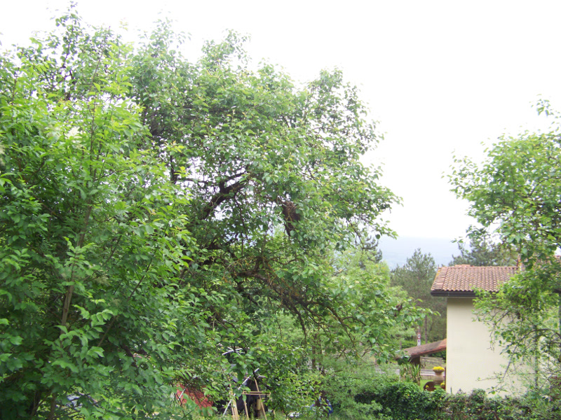 20/04/2014 - Sciame Catturato 6 Finalmente è Pasqua, si prepara il pranzo alle 15 persone invitate a casa (quindi svegli quasi all'alba...) si mangia, si chiacchera, ci si riposa....sì, questo fino alle 11:30, quando quelle maledette bestioline non hanno deciso di sciamare, loro non conoscono fine settimana o feste. Lo sciame di oggi ha preferito posarsi su un pero a circa 3 metri d'altezza. L'operazione è stata relativamente veloce, visto che ho dovuto portare giù la scala telescopica, piazzarla, ecc, ecc. Poi siccome la gente a casa era già cominciata ad arrivate, mentre stavo recuperando lo sciame avevo anche il pubblico che osservava..... Al pero non è successo niente. Ho tolto solo i rami secchi. Insomma gli altri hanno mangiato, antipasto e primo e io sono arrivato che stavano dando il secondo......alla faccia del giorno di festa. Eccovi le foto.