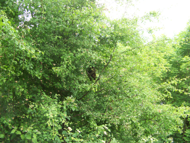 01/05/2014 - Sciame Catturato 11 (3-4 telaini) Dopo aver catturato lo sciame numero 10, mentre aspettavo che le apuzze entrassero tutte nel portasciami, mi sono un pò seduto sull'erba a riflettere...... La riflessione è durata poco perchè nonostante avessi preso la regina, vedevo che ancora c'erano molte, davvero molte api che ronzavano intorno. La cosa non mi tornava e quindi decisi di controllare. Ebbene, dietro allo sciame appena recuperato, sullo stesso Biancospino ma su un'altro ramo eccoti la risposta allo svolazzio delle api. Un'altro sciame!!!! Secondario questa volta. Ariparti verso casa a prendere un'altro portasciami, rifai i fogli cerei, ecc, ecc.
