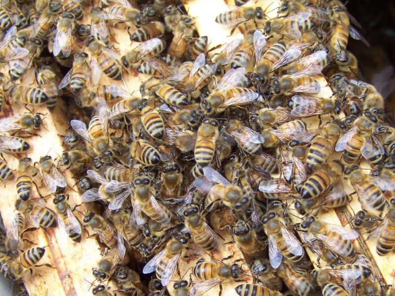 Una vota catturato, ho notato che sopra i telaini vi era una palla di api, vuoi vedere che lì dentro c'è la regina, se hanno fatto la palla....forse è vergine! Infatti era così, per farla entrare ho allargato lo spazio tra i telaini e lei, insieme alle sue api guardiane, è "rotolata" dntro senza problemi.