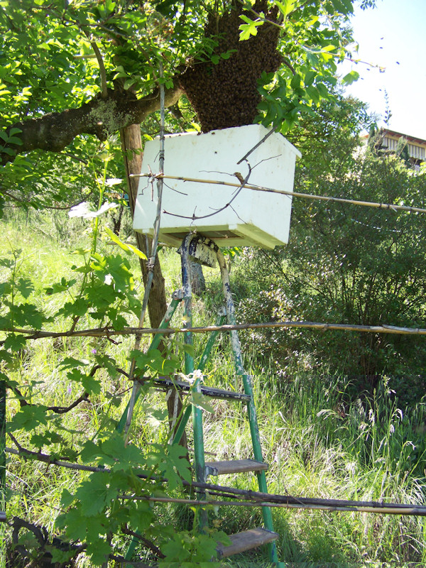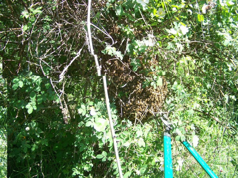 Questa volta sono sciamate su una rosa canina, tanto per essere simpatiche!!!!! Solito taglio del ramo, infilamento (eh eh eh ) nel portasciami, cattura della regina dopo mezz'ora e conseguente ingabbiamento.