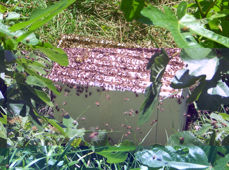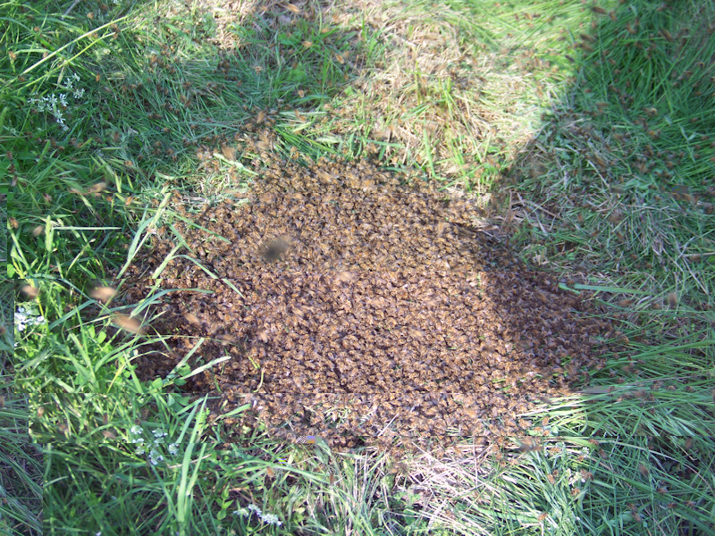 Allora questo sciame si posa...in terra!!! Sopra l'erba tagliata!!! Sì proprio in terra. Almeno sono state magnanime, non riuscivo a capire se era lo stesso sciame preso poco fa o un'altro. Allora avvicino il portasciami ed eccoti l'autostrada che entra dalla porticina. Non vedo la regina, stai a vedere che queste sono andate in uno dei posti dove la regina si era fermata. Dopo circa 1 ora, ancora ci sono molte api fuori, decido di prendere l'erba tagliata e scuoterla dentro il portasciami ed ecco che LA vedo. La regina. Era ancora fuori!!! Mi stava per volar via!!! Aaaahhhhh! La infilo come un missile nel portasciami e chiudo!!!! Dopo 10 minuti le api erano tutte entrate, dopo un'altra mezz'ora mi metto a cercare la regina, ingabbio anche questa e lo sciame lo riunisco con il metodo del giornale (ormai mi ero stancato e avevo fretta) all'arnia dalla quale credo siano uscite.