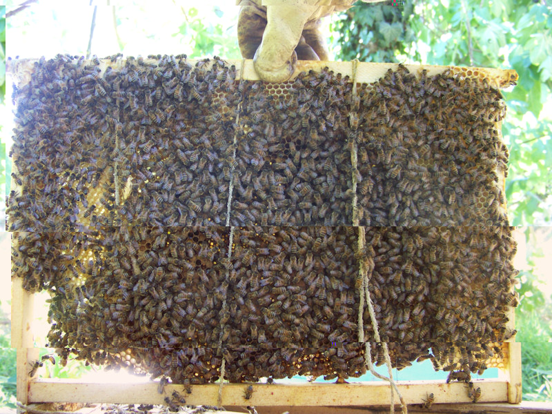 Nota: il favo che vedete in capo a due mesi era stato "ristrutturato", attaccato al telaino da tutte le parti ed era stato rosicchiato il filo nelle parti "usati" dalle api, ad esempio sopra il legno del telaino (quello che si vede guardando l'arnia dall'alto) lo avevano lasciato stare.