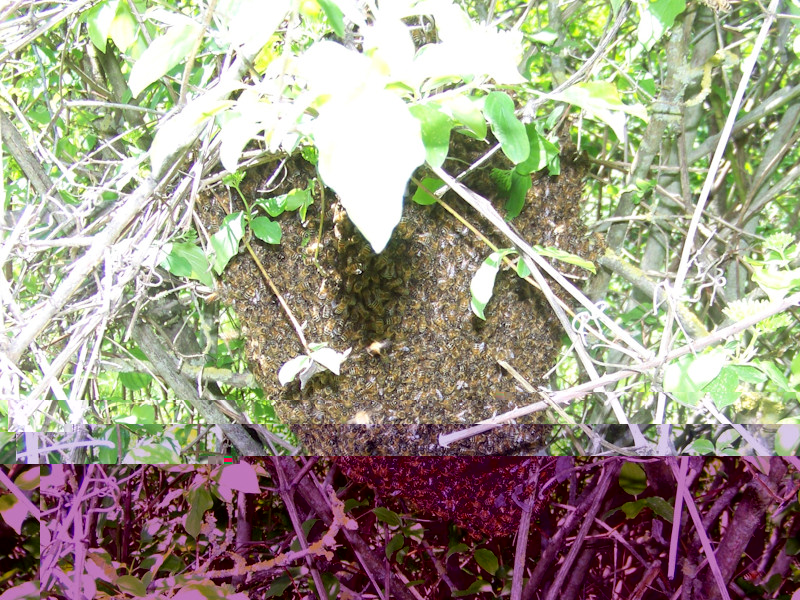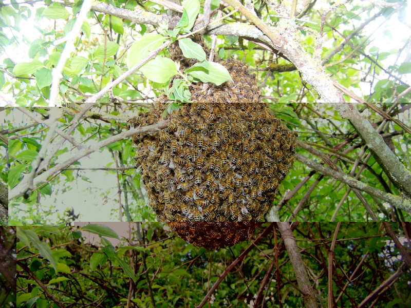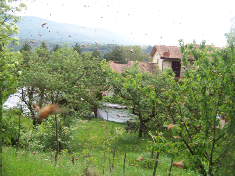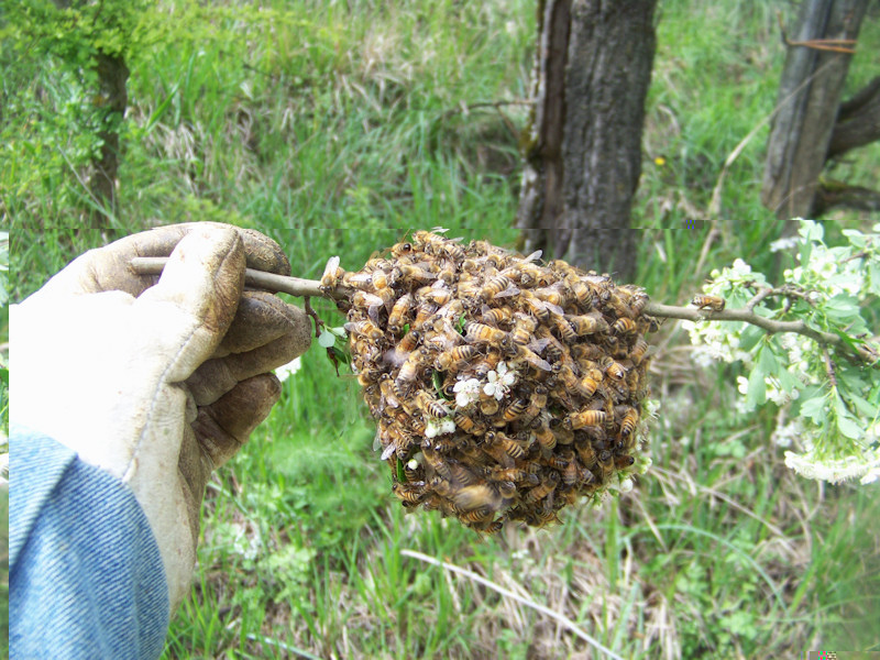 Perchè tutte le volte che dico che non ne voglio piu' spuntano fuori come funghi sciami da tutte le parti? Bastaaaaa!!!!! Voglio fare l'acaciaaaaaaa! Dopo un controllo preventivo nel mio campo, appena arrivo poco sopra le arnie sento il classico ronzio "da sciame", e mi saltano subito i nervi, mi inc@..o come una scimmia e mi preparo a raccoglierlo. Avevo visto dove si era posato, posto abbastanza accessibile, e quindi quando scendo per raccoglierlo mi trovo la sorpresa......di un'altro sciame!! Enorme!!! Vista la precedente incazzatura, decido di prenderla con filosofia e raccogliere prima questo grosso, ma quando arrivo vicino.....ce n'è un'altro sopra quello grosso!!!! Noooooooooooo, non ne posso piu'. Ho adoperato la tecnica cinese, ragionando a mente fredda ho aperto le arnie, ho visto da dove era uscito lo sciame secondario (arnia 11) e l'ho rimesso dentro!!!! Regina compresa, faranno icchè vogliono come si dice da noi. L'altro enorme l'ho riunito con quello piccolino, e anche queste faranno icchè gli pare. Uffa!!!!! Almeno uno l'ho rimesso dentro. Ma dico io avevo controllato tutte le arnie per trovare celle reali, ho tolto telaini con covata per fare gli sciami, ho tolto anche telaini con scorte, praticamente in ogni arnia ho tolto 3 telaini tra covata e scorte, non avevo trovato celel reali.....ma se le sono fatte lo stesso e sono sciamate ugualmente. Ma come si fa a non farle andar via? E con questi sono a 5 sciami raccolti. Allego foto. Saluti