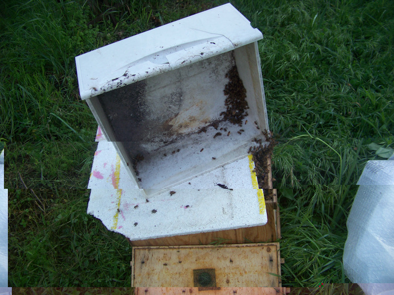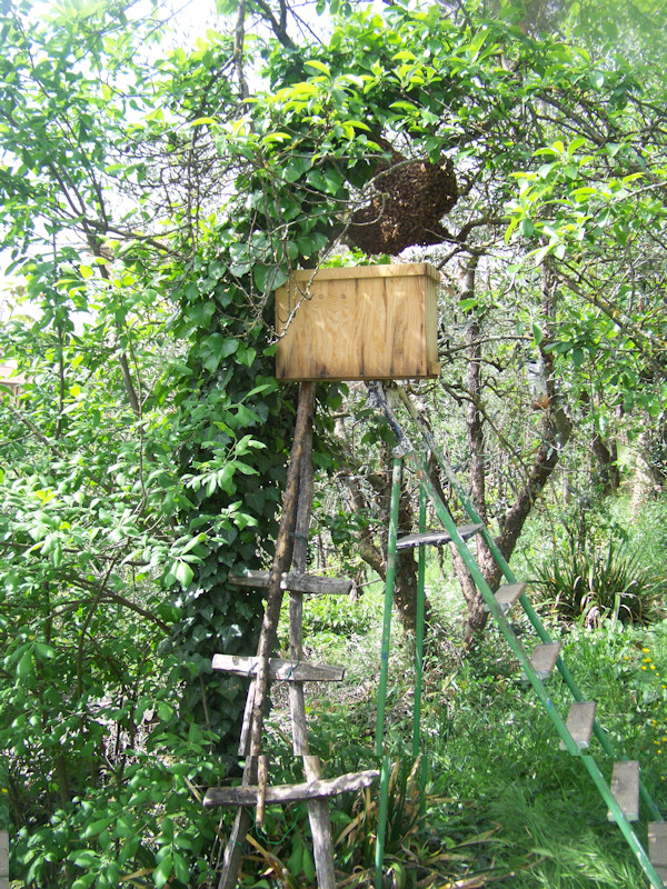 30/04/2012 In questa data il sottoscritto, reo di aver commesso il crimine di dire "Non voglio piu' sciami" è stato costretto, suo malgrado, a raccoglierne ben tre!!! Sì tre in un giorno solo!!! Il primo si è posato su un olivo a circa 2 metri d'altezza, recupero facile. Il secondo invece è andato su un pero a circa 4 metri!!! Il terzo, sempre sullo stesso pero, ancora piu' in alto del primo, circa 50 centimetri piu' in alto del secondo. Il primo l'ho recuperato posizionando un portasciami in lego sopra una scala di quelle da casa (come in foto), dopo circa mezz'ora erano tutte dentro. Il secondo l'ho preso scuotendo il ramo e facendo cascare piu' volte le api, alla fine sono entrate nel portasciami. Contento di aver fatto il tutto in un tempo ragionevole, stavo per tornare a casa quando mi passa sopra la testa il terzo sciame appena appena sciamato!!!! Nooooo!! Ho aspettato che si posasse e, siccome avevo finito i portasciami, l'ho messo dentro un cassetto da frigorifero. Come? Ecco. Non arrivandoci e non avendo piu' portasciami mi sono attrezzato di conseguenza, ho preso un vecchio cassetto da frigorifero. Complice il tempo che stava volgendo a pioggia (pioveva già ma molto poco), l'ho coperto con una lastra di polistirolo, lasciando aperto solo un piccolo spiraglio, poi ci ho messo un tetto di nylon in modo cha non entrasse l'acqua, il problema allora era: come far entrare le api che erano a circa 5 metri di altezza? Idea malsana: ho messo due scatoline usate di quelle che ci si mette dentro la regina, poi ho scrollato un pò di api dentro e le ho lasciate lì, ha piovuto percirca un'ora, ma quando sono andato a prendere il cassetto erano tutte dentro!!! Le scatoline di plastica già usate per le regine sono fantastiche, hanno l'odore della regina e praticamente le api si agglomerano attorno, utilissime!!! Ho riunito il rpimo e il terzo scima con le arnie di provenienza, mentre il terzo ho formato uno sciame a sè. Inutile dire che mi sono stufato!!!! Io non ne volecvo raccogliere...e sono già a 10!!!!! Allego foto. Saluti
