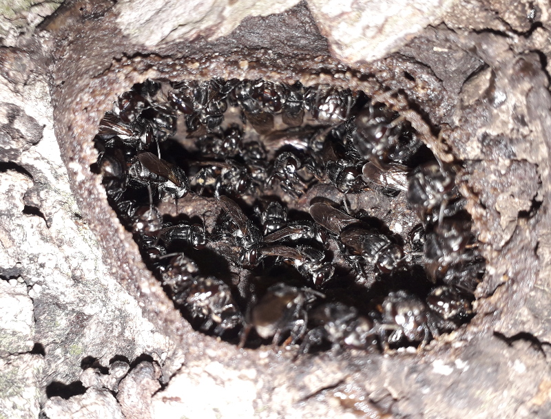 Sono sempre stato convinto che queste fossero api carnivore, ma cercando su google non ho trovato nessun riferimento ad api che mangiano carne, eppure quando lascio la carne a seccare al sole, soprattutto nei primi momenti, quando e' ancora molto secca, queste api si accaniscono in massa staccando pezzettini di carne e portandosele a casa. La faccia che hanno, e la forma del corpo, a me ricorda molto di piu' le api piuttosto che le vespe. Non hanno il pungilione, o almeno non ho mai sentito nessuno che fosse stato punto da questi esseri, quando si arrabbiano al massimo ti volano tra i capelli emanando una puzza fastidiosissima. Nonostante manchino di pungilione sono molto aggressive e non esitano a attaccare in massa chiunque gli dia fastidio.