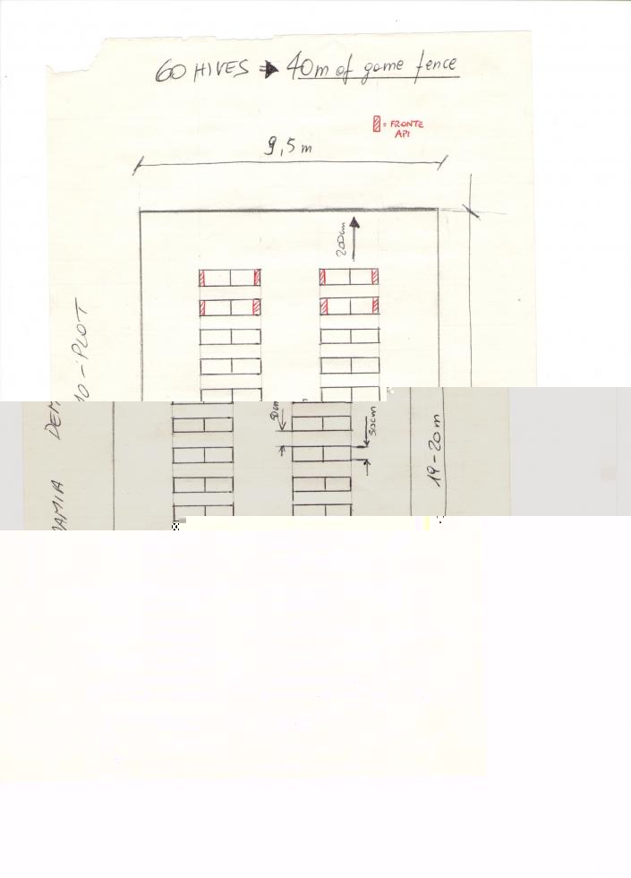 Buongiorno a tutti, nuovamente chiedo consigli dal continente africano... In allegato potete trovare una mia bozza per la realizzazione di un Apiario da 60 arnie. Ho creato corridoi laterali e frontali di 180cm per poterci lavorare all'interno ed avrei pensato alla disposizione di 4 arnie per fila con le uscite per le operaie indicate in rosso. Devo costruire tutto all'interno di un recinto per ragioni "locali" ed attorno sui tre lati verrano piantati girasoli e fiori locali. Sulla sinistra sono già presenti circa 2 ettari di macadamia e a circa 500 metri un'enorme foresta con un fiume che l'attraversa.