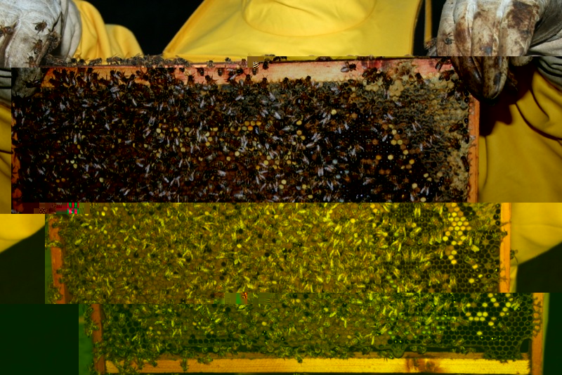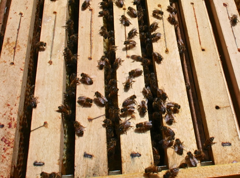 Famiglia ancora scarsa, continua importazione di nettare e polline, vista la regina ma covata opercolata irrilevante, naturalmente durante la visita ha cominciato a piovere a bicchierate nonostante il sole a sprazzi, non ho potuto verificare la presenza di larve.