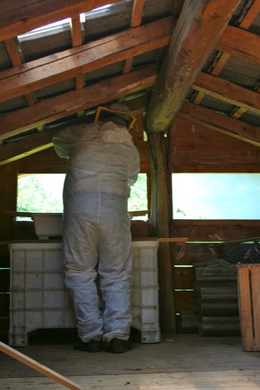 Nel frattempo ho contattato due amici Gigi e Luigi apicoltori da qualche anno x hobby, oltre ad alcune informazioni mi hanno rifornito di maschera, tuta in tessuto non tessuto e guanti, nonché acido ossalico