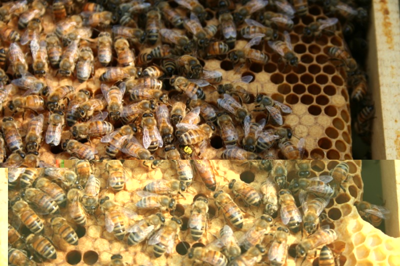 Lunedì 22 ho visitato, il nuovo nucleo ha una bella regina che spara uova a mitraglia , la Gialla si é ripresa bene e depone instancabile, la rossa ha popolato il nido in modo incredibile (occupano anche il predellino,visto la temperatura) e si é sempre rifiutata di sciamare,(forse perché é al primo anno) il melario ha solo 4 telaini pieni o quasi, due dei quali opercolati. Sinceramente il miele non mi interessa molto a confronto del piacere che mi da il vedere questo mondo per me nuovo.