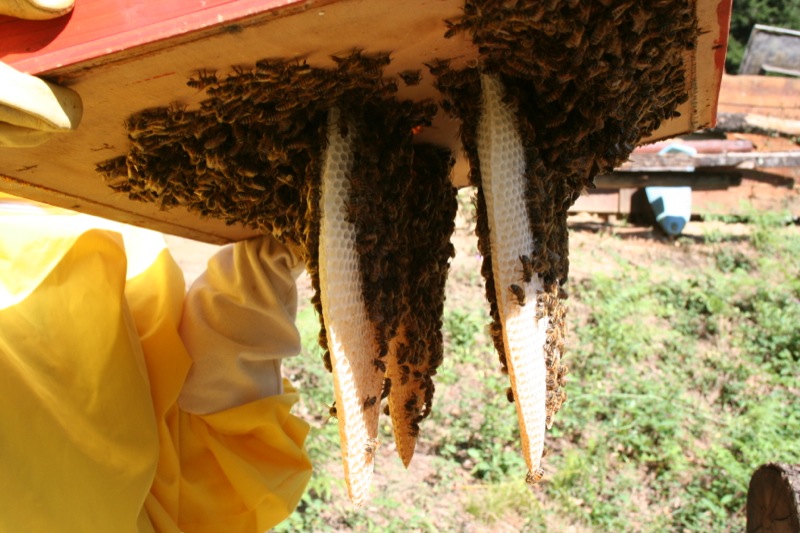 Nello spazio centrale tra i favi naturali é collocato il telaio con la Regina.