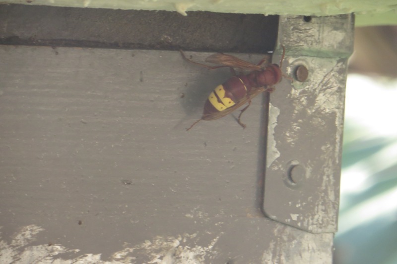 Da un paio di giorni c'è un calabrone nero con riflessi rossastri e due strisce gialle sull'addome, che ronza attorno alle arnie.