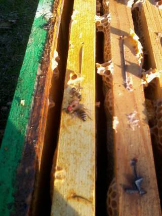 A metà novembre visitando le mie arnie ne ho trovata una in cui la quantità di api era diminuita drasticamente....forse dovuto al carico di varroe che non sono riuscito a controllare durante l'invernamento...a quel punto ho tentato il tutto per tutto stringendola il più possibile, visto che la regina aveva deposto una piccola rosa di covata, e spostandola all'interno di una tettoia poco utilizzata e con una parete sempre aperta nel tentativo di attenuare il freddo..... poi il 5 dicembre ho fatto l'acido ossalico alle altre e con l'occasione ho controllato anche l'arnia in questione.... quando ho tolto il coperchio sono rimasto senza parole nel vedere 2 api e la regina morte sopra ad un telaio nell'estremo tentativo di riscaldarsi.....