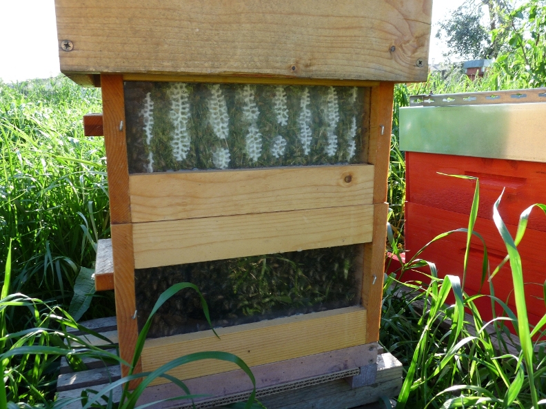 Praticamente, le api hanno costruito celle da fuco che poi hanno evitato di riempire con il miele, aspettando presumibilmente che la regina andasse a deporre, cosa impossibile, vista la presenze dell'escludiregina. Nelle immagini si vedono i melari quasi pronti per la seconda smielatura mentre i telaini con favi naturali avevano saltato anche la prima perché mezzi vuoti e le api hanno continuato a riempirli a rilento. Di fatto, durante tutta la stagione questi favi non sono mai stati riempiti completamente e tanto meno opercolati.