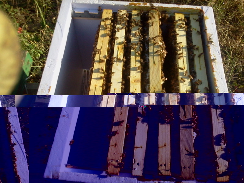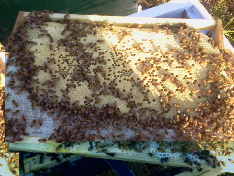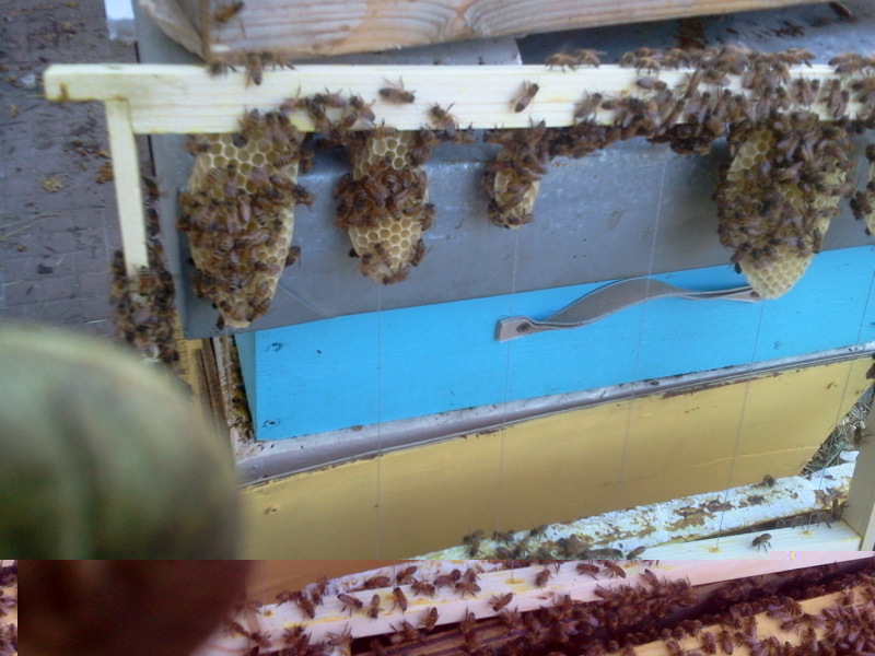 Ho fatto 4foto con i favi construitisolo con uma strisceta di cera di4 cm e un telaio meso ieri sera dove si vede come hanno cominciato a construire pecato che avevo la bateria scarica volev fare una foto con unfavo construito del anno scorso