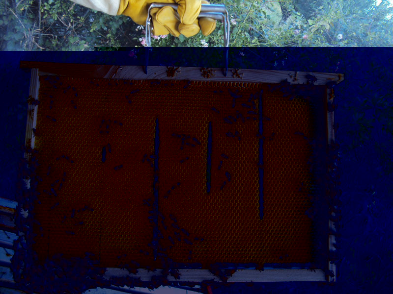Oggi prima visita con marcatura della regina (bianca); Obombo ci ha quasi azzeccato. L'unico telaino rosicchiato (però quasi al centro, intorno al filo) è stato il C2.