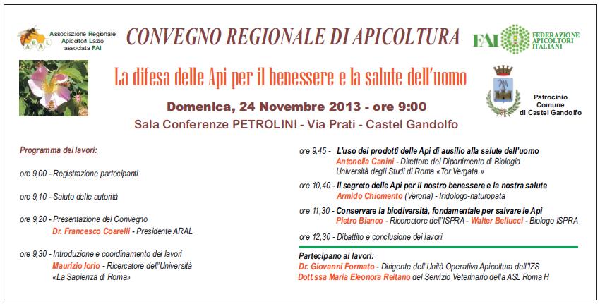 Domenica 24 novembre 2013 ore 9:00 presso sala conferenze Petrolini via Prati Castelgandolfo, L'ARAL -Associazione Regionale Apicoltori Lazio- associata FAI ha organizzato il convegno Regionale di Apicoltura sul tema La Difesa delle Api per il Benessere dell'Uomo.