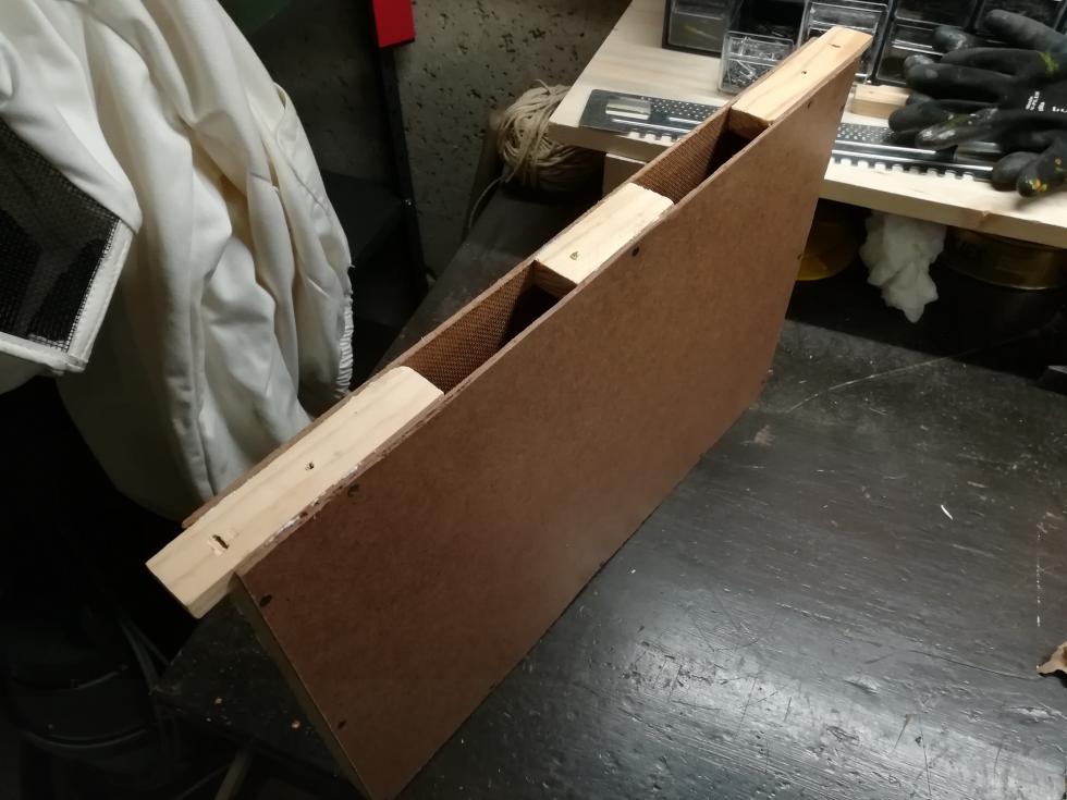 Io ho tolto il filo dal telaino, la stanghetta inferiore orizzontale del telaino è troppo stretta e devi prendere un listello dello spessore di quella superiore altrimenti le pareti laterali non aderiscono. Poi ho tagliato il telaino nella parte superiore creando due bella aperture per poterci versare il nutrimento. Poi ho preso la misura del telaio ed ho tagliato due pannelli di faesite che ho poi incollato con la vinavil ed inchiodato.