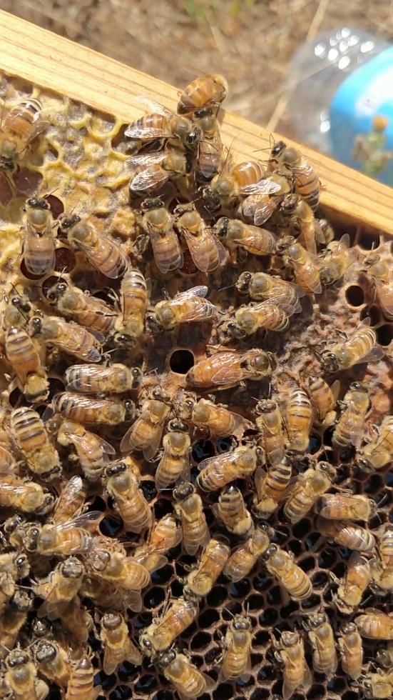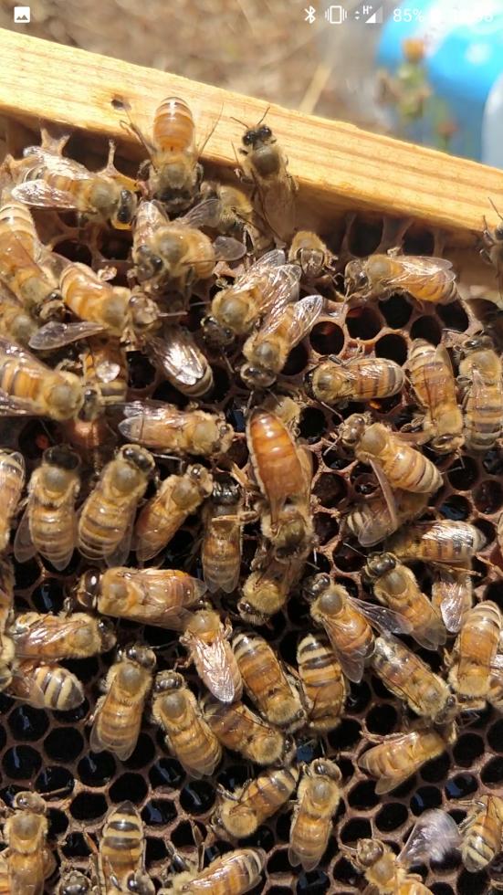 Le api la ricoprono di attenzioni, le stanno tutte sopra a volte. Ho il dubbio che abbia qualche malformazione interna dell'apparato genitale perché a volte inserisce l'addome dentro le celle senza deporre. Inoltre l'addome è piuttosto tozzo , e trovo che sia lungo più che altro quando prova a deporre. Magari sta cercando di imparare .. Metto qualche foto: