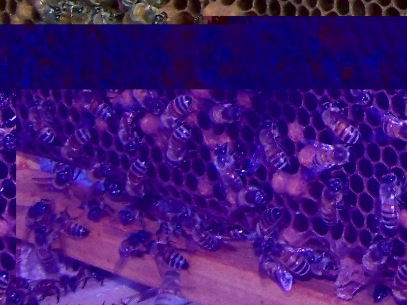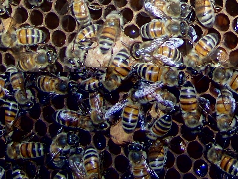 renzo ha scritto: Con tutte quelle celle reali, troverei strano che non sia nata una regina buona. La regina appena nata e' grande circa come un'operaia, solo che l'addome ha la forma diversa. Non e' facile individuarla finche' l'addome non si ingrossa, e capita dopo la fecondazione. Anche perche' e' molto mobile Ho allegato una fotografia, potrebbe essere quella cerchiata la regina? renzo ha scritto: L'espressione "celle aperte" e' un po' vaga. Di solito quella che sfarfalla normalmente ha il cappellotto circolare rosicchiato e aperto (tipo tombino aperto), le altre sono forate di fianco..... La cella in fondo mi sembrava aperta come dici tu, le altre semba non siano opercolate, sono forse stat costruite e non usate ? Impossibile (credo) la sciamatura, troppe poche api...... renzo ha scritto: Quanto alla regina fucaiola, e' esternamente grossa ed uguale ad una regina feconda, non basta che ci siano celle da fuco per dedurne che ci sia una fucaiola Di api estremamente grosse, non mi sembra di averne viste, ma ho fatto un controllo veloce soprattutto per vedere se c'era presenza di scarabei perchè essendo ancora nel portasciami, l'ingresso dello stesso è abbastanza largo da poterli far entrare.... Ora il problema degli scarabei l'ho risolto. renzo ha scritto: Comunque alla base di tutta la faccenda, manca il controllo dei tempi. Devo essere sincero, non ho tenuto conto dei tempi..... Il 14/06 ho riunito i due sciami ed ho messo un telaino di covata (credo fresca e non). Il 18/06 da controllo effettuato, ho notato ALMENO una cella reale opercolata (in fondo al telaino), sono quasi sicuro che nel telaino che ho messo NON c'era. Ho notato anche altre celle reali aperte. Il 29/06 la cella che era opercolata (in fondo) era aperta, mi sembra proprio come un tombino, le altre sono aperte con api che ci vanno a mettere il muso, ma non si riesce a vedere se dentro c'è qualcosa o no. Ora, facendo due conti: - uovo, dal 1 al 3 giorno - nutrimento con pappa reale, dal 4 al 9 giorno - cella chiusa, dal 10 al 15 giorno - nascita 16 giorno Mettiamo che sia stata chiusa il giorno che ho messo il telaino, quindi il 14/06, il 19/06 si doveva aprire ed il 20/06 doveva nascere la regina. Volo di fecondazione dal 25/06 al 02/07, dopo 5-15 giorni, giusto? E per la deposizione delle uova altri 2-5 giorni, dal 27/06 al 02/07 o dal 04/07 al 07/07. Quindi dovrebbe essere fecondata in questo periodo e cominciare a deporre tra poco. Ho sbagliato qualcosa con i tempi? Allego alcune foto.... Che ne dite delle celle dei fuchi? Sono tante? Sono disposte in modo "non regolare"? Se non c'è la regina, che devo fare? Grazie
