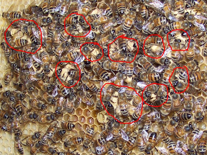 Con tutte quelle celle reali, troverei strano che non sia nata una regina buona. La regina appena nata e' grande circa come un'operaia, solo che l'addome ha la forma diversa. Non e' facile individuarla finche' l'addome non si ingrossa, e capita dopo la fecondazione. Anche perche' e' molto mobile.