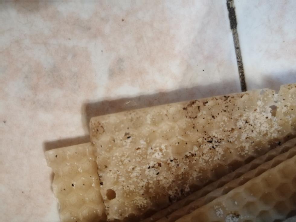 rosura: i residui del lavoro della tarma, oltre alle uova dovrebbero esserci dei filamenti sericei: anidride solforosa e ammazzi tutto (senza rendere fragile la cera che a bassissime temperature rischia di sbriciolarsi), puoi usare quella in bombolette, se la trovi, o fumigare bruciando i dischetti di zolfo che si usano per sanificare le botti (di più facile reperibilità) Non respirarla che fa male