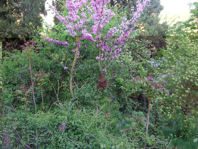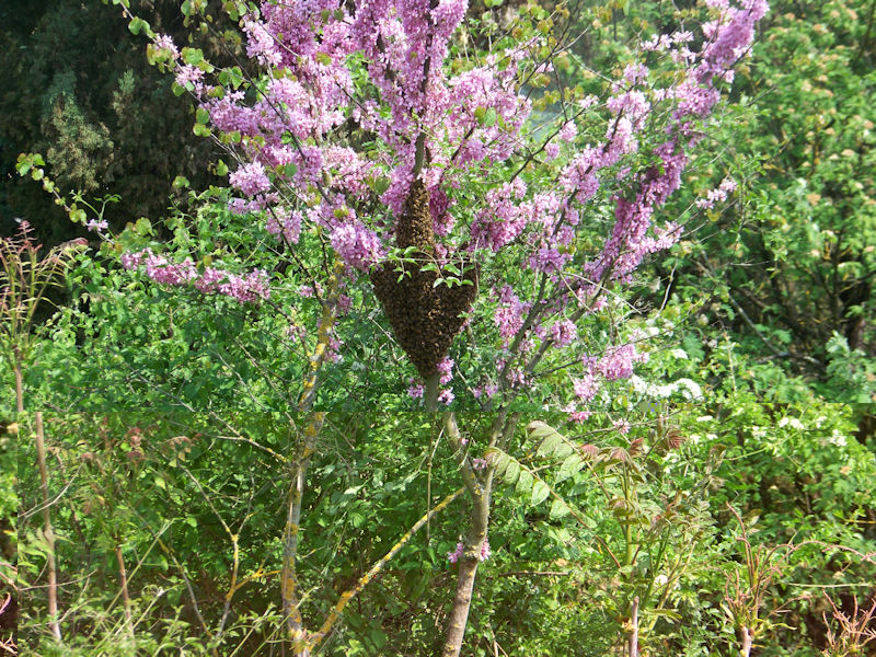 Lo sciame si è insediato nello stesso albero del quarto mio sciame preso, l'"albero di giuda" o "spino di giuda" (guardate il mio quarto sciame e vedrete che è lo stesso albero).