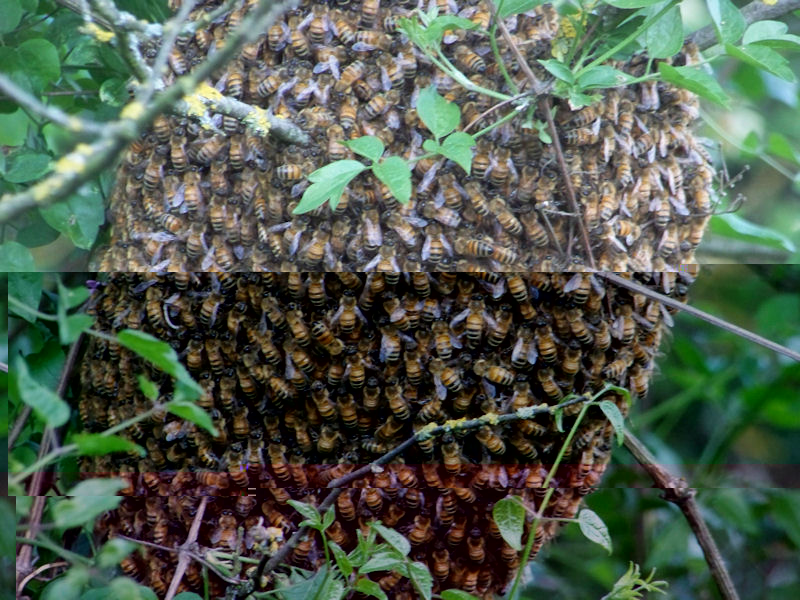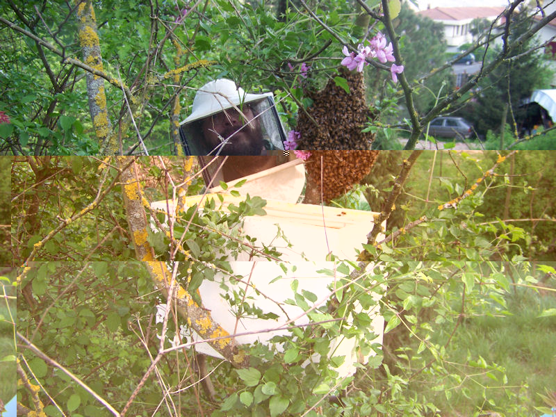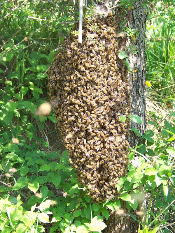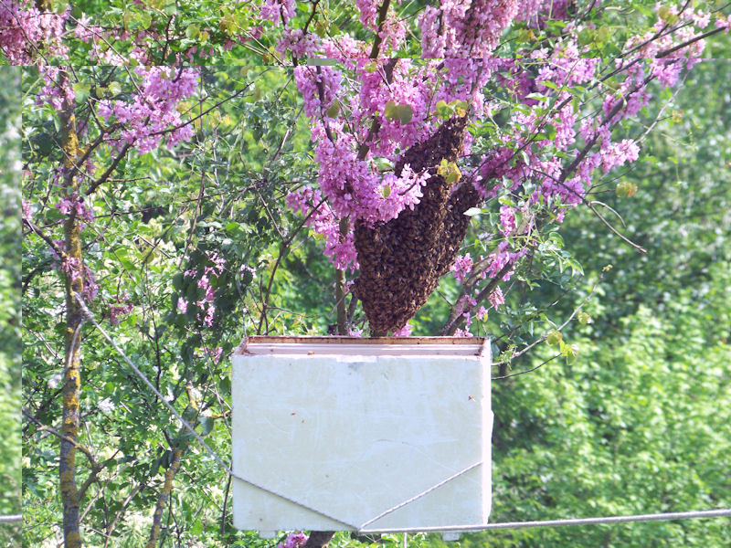 Uno sciame attaccato ad un'albero al quale avevo mozzato un quarto di tronco per prendere uno sciame, pochi giorni dopo sono risciamate sul tronco, e l'ho tagliato a metà, questa volta si sono aggrappate al pedano!!!! Non ho avuto il coraggio di tagliarlo, così sono andato di spazzola.