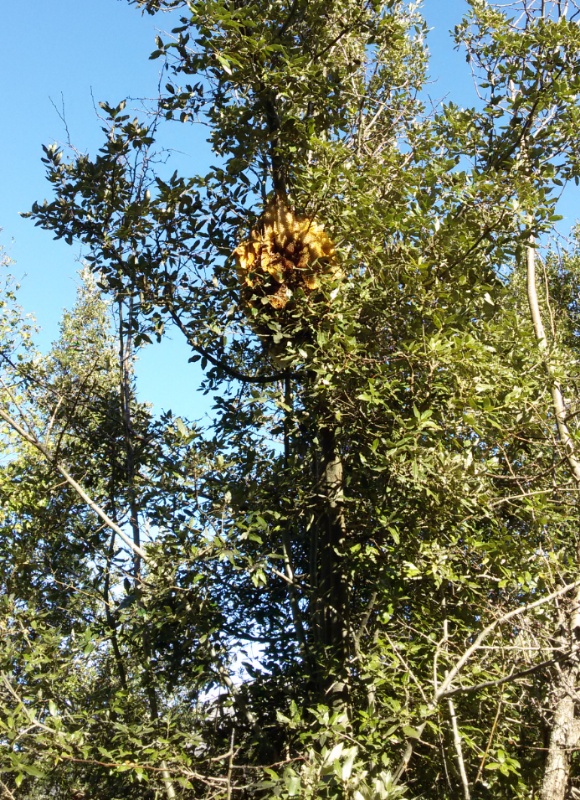 Converrebbe tagliare i rami che sostengo l'alveare e metterlo in un doppio melario con fondo e tetto. Almeno lo ripari. E poi dovresti trattarlo con qualcosa. In primavera (se ci arriva ma dubito) sistemi le cose con fogli cerei e altro. È largo circa 30 cm e alto altri 50 cm, si sono sistemate a 4 m di altezza..! Sono appena tornato a guardarlo, ma non si vede niente di vede niente su di esso.. :/ in più ho controllato sotto l'albero... ce ne sono alcune morte... Non so se si sono messe nella parte inferiore o se sono già morte tutte.. il freddo di ieri notte forse gli è stato fatale...?