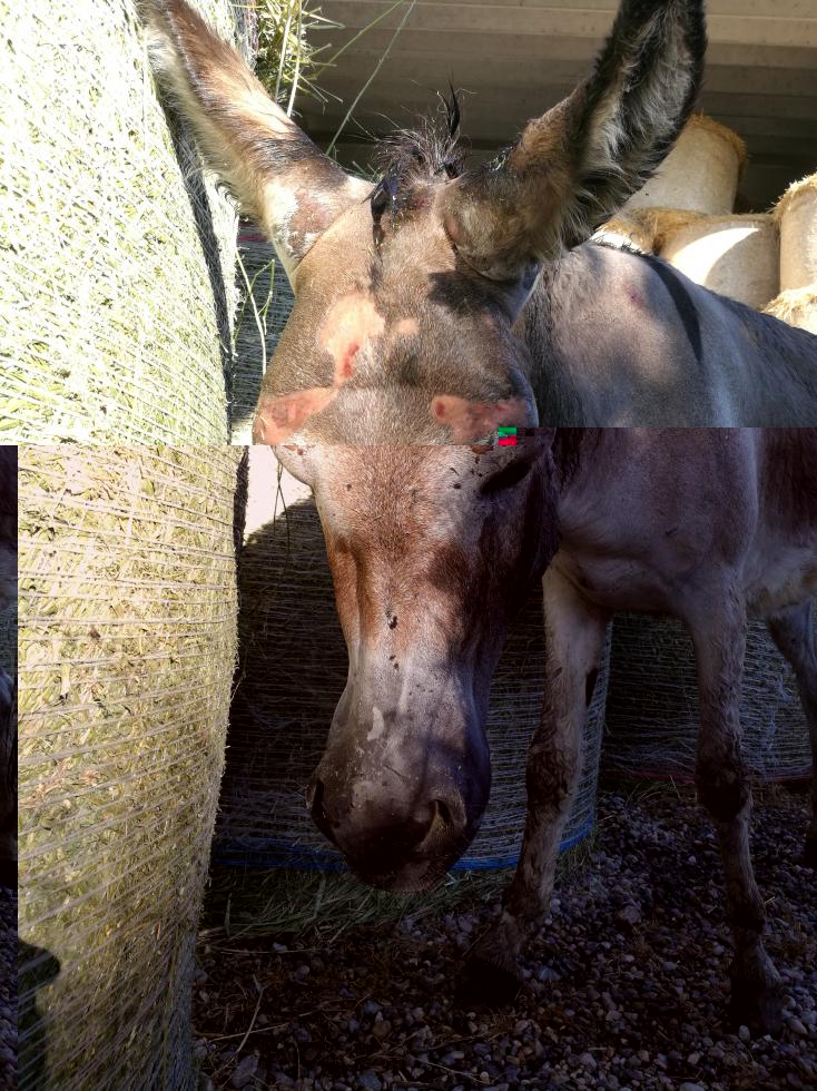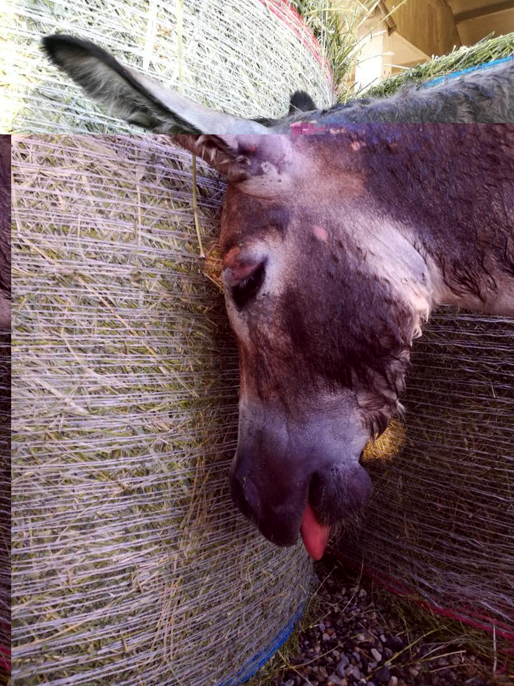 Salve, ho portato un asino maschio per accoppiarsi con la mia asina di 4 anni. L'ho tenuto con lei per quasi un mese e mezzo senza nessun problema di compatibilità. Sabato scorso sono andato in stalla e ho trovato la mia asina con la testa pelata e sanguinante (le estremità come sopra agli occhi, fronte ecc...), nessuna traccia di ferite profonde, due morsi sulla criniera, muso gonfio, lingua rossa fuori a penzoloni, rigonfiamento sotto al mento. L'abbiamo immediatamente bagnata e chiamato uno dei nostri veterinari che era disponibile. Fatto antibiotico, B12, tachipirina e cortisone. La situazione si è mantenuta stabile per 48 ore. Il resto del corpo non presentava nessuna lezione. Camminava ma tendeva ad appoggiarsi alle pareti con la testa. Sembrava fosse cieca o quasi, alcuni ostacoli di scansava all'ultimo momento, atri no. Dopo due giorni è morta. Il veterinario specializzato in equidi non ha fatto in tempo a venire. L'aveva visitata solo un veterinario di bovini.