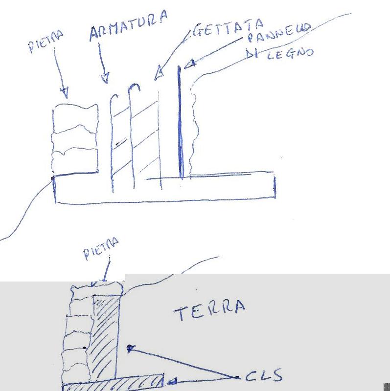 perche' non utilizzi invece gli ecoblocco? sono a totalmente a secco (non necessitano di permessi a costruire) e alcuni modelli sono piantumabili Considera che comunque le pietre abbondano e dovrei pure trasportarle per buttarle (uso pietre di circa 25 cm + 30 cls). Gettando ad ogni fila non avrei problema di cedimento perchè dal lato a vista verrebbero comunque cementate e dall'altro vengono inglobate quando si getta il cls controllando bene che entri nelle fessure. La sommità presenta solo pietre che nascondono il cemento. Ho buttato giù a mano uno schizzo dell'opera.