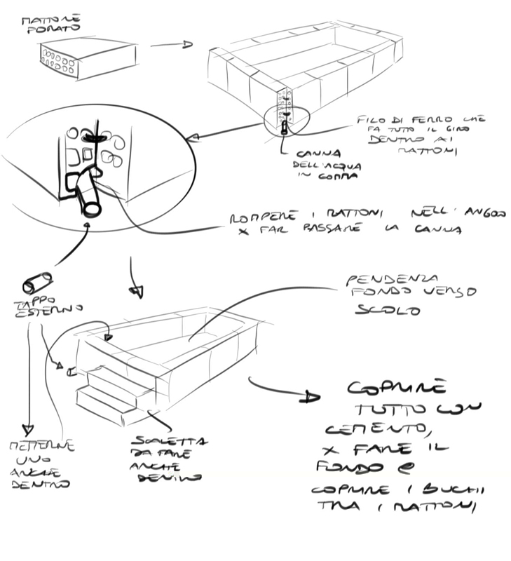 prendi un po' di mattoni di quelli un pò grandi e vuoti...poi vedi tu che dimensioni ti servono... fai il tuo bordo mettendoli in verticale, così che il laghetto viene alto 35-40 cm. Poi fai passare un fil di ferro dentro a tutti e lo stringi per tenerli bene uniti. In un angolo in basso metti una canna dell'acqua(quelle in gomma, ti servirà come scolo). a questo punto coli sopra il cemento, un po' per fare il fondo, un po' sui mattoni per fare una superficie piatta e impermeabile. attento a non coprire lo scolo, nè in entrata nè in uscita. se riesci fai il fondo leggermente in discesa (se il cemento non è troppo liquido riesci) e metti lo scolo nella parte più bassa. conta anche che quando lo svuoti è meglio se fuori c'è un "canalino" che ti porta via l'acqua, in un posto che non dia fastidio e dove si possa assorbire...la mia finisce nella siepe che costeggia il pollaio (almeno quella che non finisce prima nelle tane dei topi!:) ) fuori cementa anche due o tre mattoni per fare una scaletta di accesso..serve soprattutto per i pulcini, e fai lo stesso dentro creando una piccola riva, per farli uscire. lo scolo fatto con la canna dell'acqua lo chiudi poi con dei banali tappi di Plastica delle bottiglie (quelli che sembrano di sughero), uno lo metti all'interno e uno per sicurezza all'esterno. Può essere che tra la canna ed il cemento passi un po' di acqua quando è nuovo..metti un po' di silicone (io ho fatto così) e vedi che non esce più nulla.