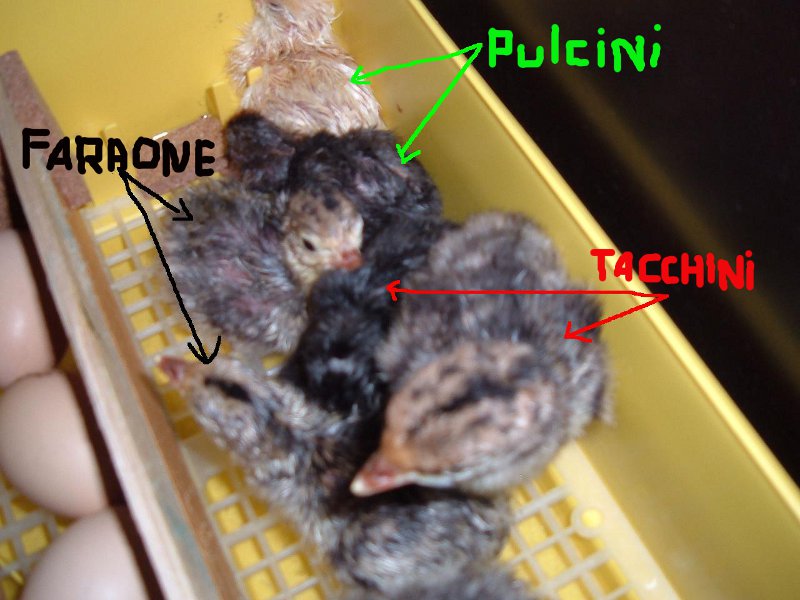 salve a tutti nella mia terza incubata ho messo un pò di tutto vi spiego: 4 uova di oca 11 uova di faraona 9 uova di tacchino 2 uova di fagiano 2 uova di mericanella 18 uova di galline comuni dalle sperature alla fine sono rimaste 3 uova di oca 4 uova di faraona 8 uova di tacchino 2 uova di fagiano 2 uova di mericanella 14 uova di galline comuni da ieri sera stanno iniziando a nascere vi allego qualche foto