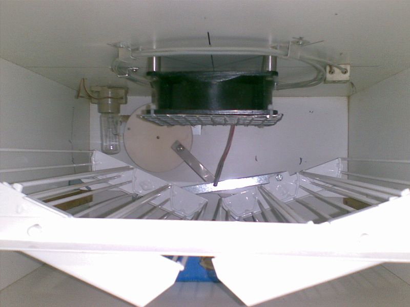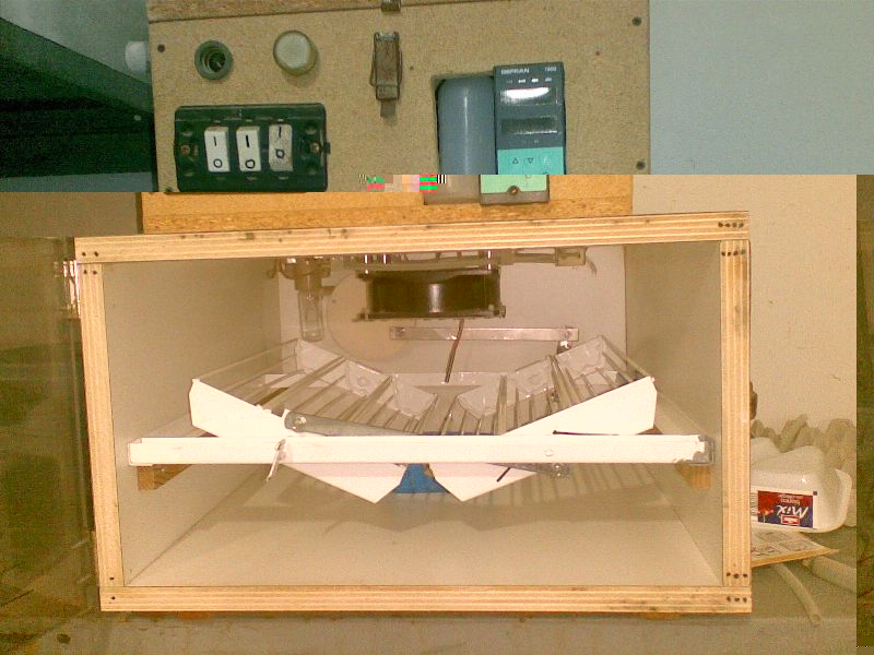 Ciao, per esperienza ti consiglio di non fare accrocchi perche andresti incontro solo a delusioni....... Costruisci la struttura con il multistrato laminato (nei negozi di bricolage te lo tagliano gia a misura devi solo assemblarlo).Al posto della lampada usa una resistenza al silicone e una ventola 120x120 si trova facilmente in negozi di elettricita'.Per il termostato descrivimi il modello ma ti consiglio un tipo professionale (gefran,omron,siemens ecc,ecc).Per il voltauovo ho usato un motore del girarrosto con un opportuno leverismo (vedi foto). In bocca al lupo Ciao