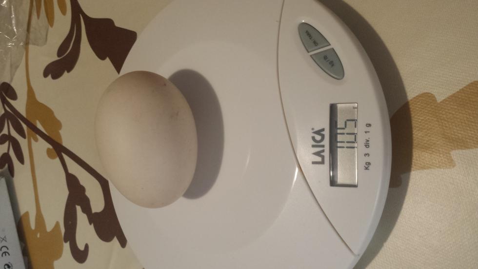 Aggiornamento. Da quando ho introdotto il mix di uova-gusci di lumache nell'alimentazione non mi ha più fatto uova molli o incomplete, anzi ora il guscio è bello duro e resistente, quindi sarà stato un calo di calcio dovuto all'inizio della deposizione, comunque continuo a darle il mix (che le piace molto, anzi è la prima cosa che va a cercare nel mangime). Riguardo l'irregolità delle uova, se prima si parlava di un 50% uova normali con un 50% uova doppie, ora la percentuale si è molto abbassata sarà circa del 15% quelle fuori-norma. Qualche giorno fa, però, mi ha sorpreso ancora (forse tenta di superare qualche guinnes)... ha prodotto un uovo gigantesco! cerco di allegare la foto. Un uovo ben più grande delle sue solite uova doppie (che pesano 80-85 gr rispetto ai 60-65 gr di quelle normali) dal peso di ben 105gr. Il giorno dopo ha fatto un altro uovo gigante, seppure leggermemte più piccolo, di 100gr. Non li ho ancora aperti, ma suppongo, dato la mole, che contenga ben 3 tuori. (Vi farò sapere)