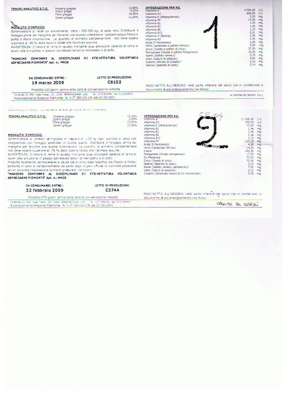 ciao a tutti, riprendendo questo vecchio topic, vi chiederei dei pareri sulle etichette di 2 rispettivi mangimi (chiamiamoli n. 1 e 2)